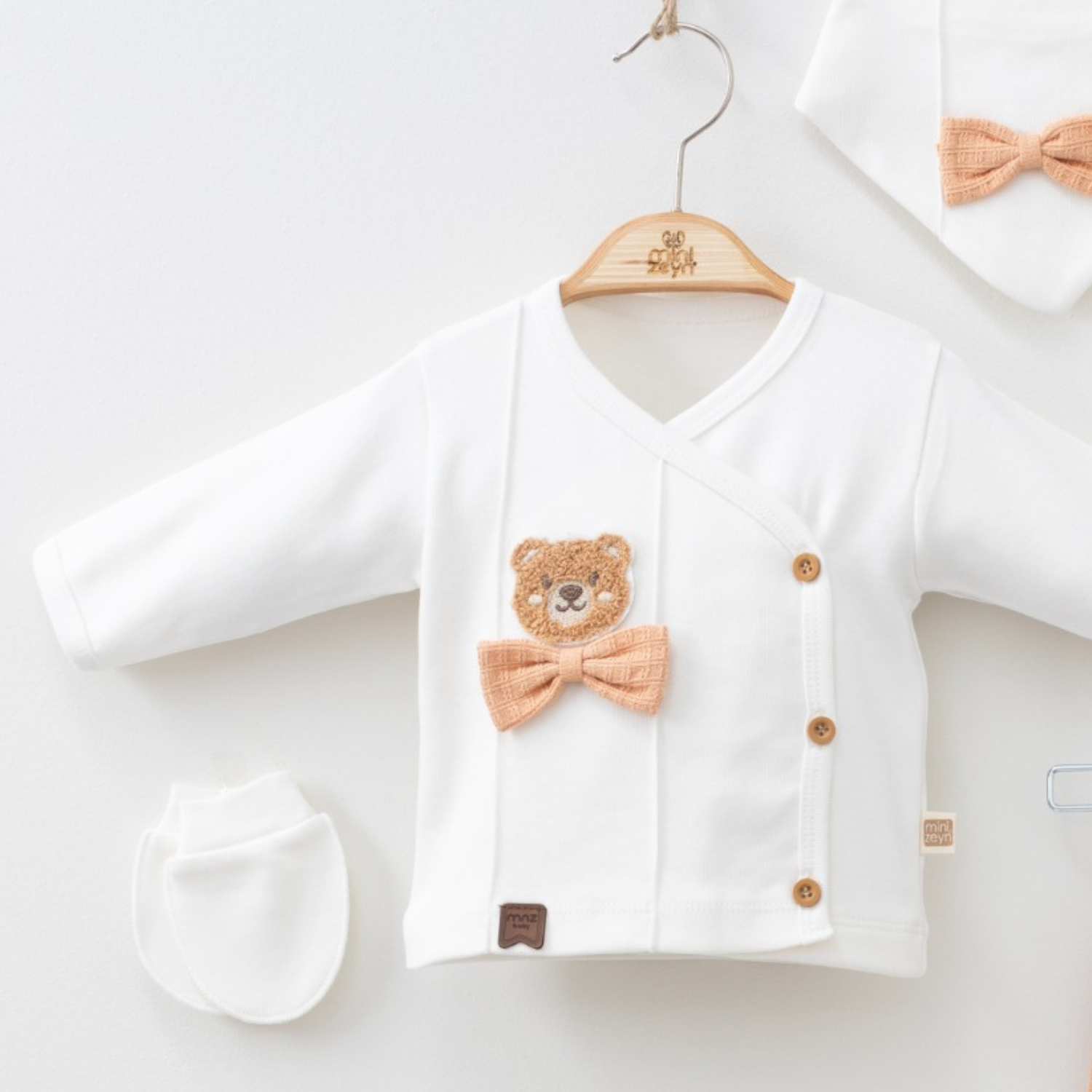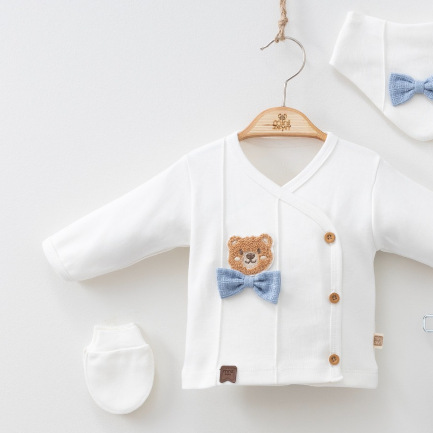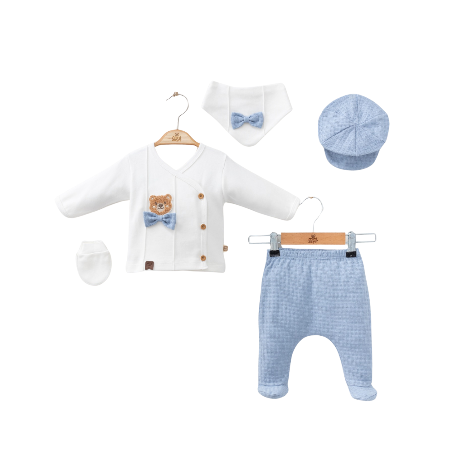 Very important to be stylish from the first day with this beautiful 5 piece themed pajama set that includes an asymmetric opening top (100% Cotton), cotton pants with closed-in feet (100% Cotton), a bib and matching anti-scratch mittens and warm hat for your new little one.