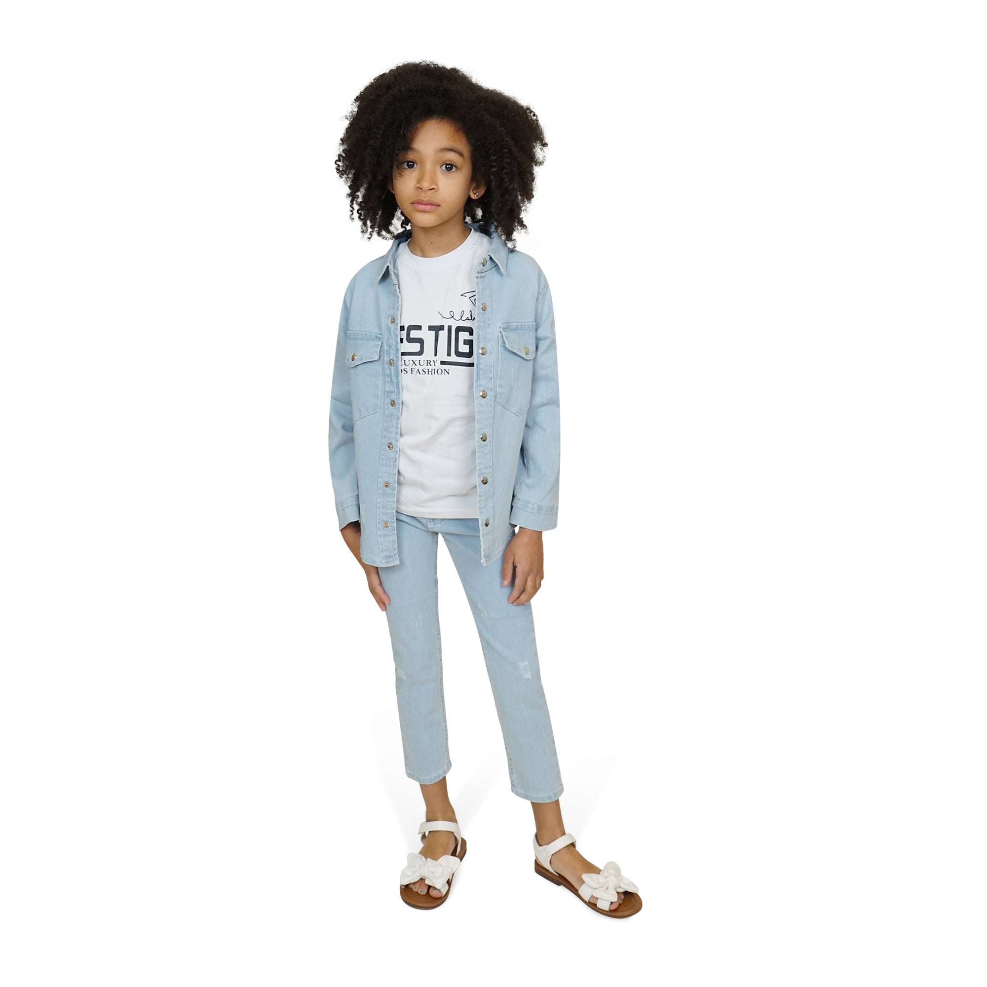 Ensemble en jean simple et à la mode pour votre petite chérie avec une veste en jean en tricot, un t-shirt imprimé et un jean skinny avec une taille élastique (100% coton)