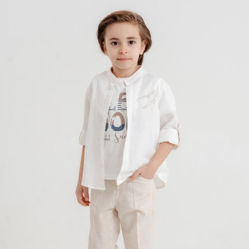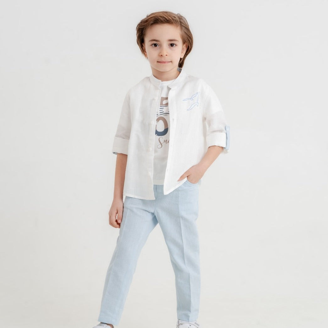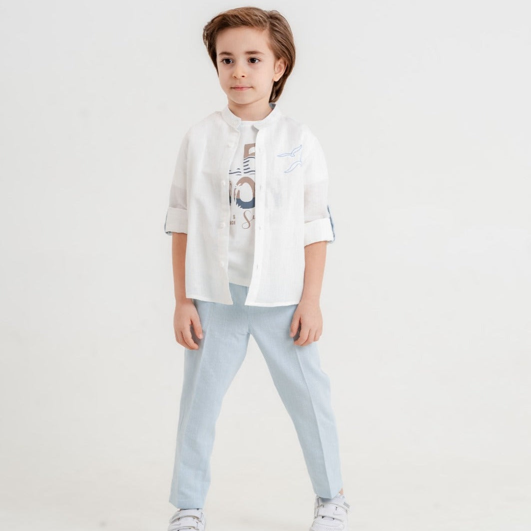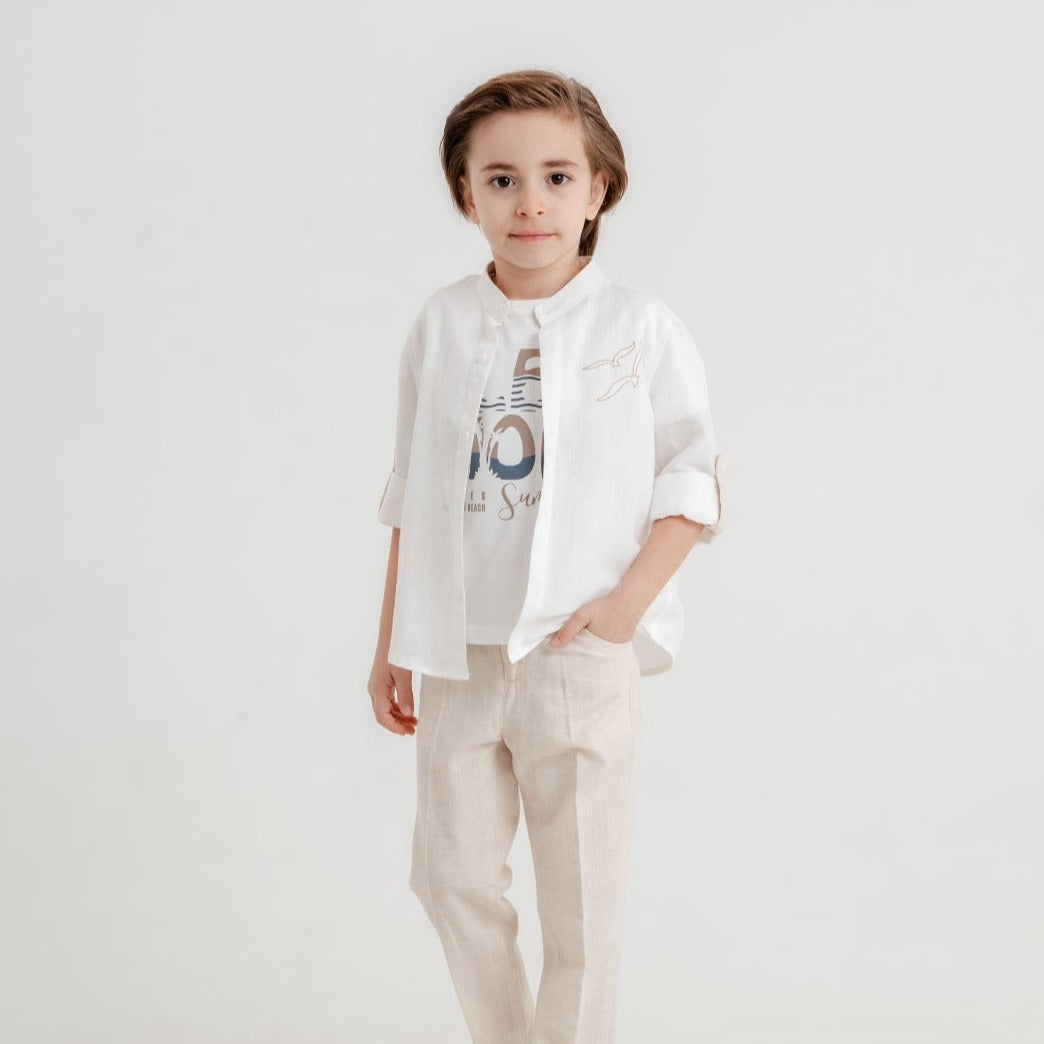Indulge your little superstar with this luxurious and comfortable outfit. It includes a long-sleeved cotton shirt (100% cotton), a soft cotton t-shirt, and stretchy linen-blend cotton pants. Perfect for both casual wear and special occasions.