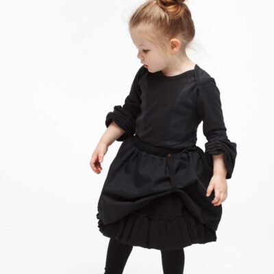 Corset Shirt Extravagantly constructed shirt with ruffled sleeves made from two different types of organic cotton (Villasor / Maui) with shoulder pads and press-studs at the crotch. Like a soft suit of amour with the certain something. Colour: Black Villasor: 95% certified organic Cotton, 5% Elastan (0,8m) supplied by Tessuti e Tessuti Maui: 95% certified organic…