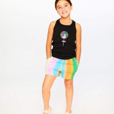 The organic cotton jersey tank top in black is a playful essential for warm days. This sleeveless tee features a round neckline, racerback cut, and a fun sequin lollipop appliqué at the chest. Made from soft organic cotton with a touch of elastane, it offers comfort, stretch, and breathability while being eco-friendly.Sizes 2 and 3…