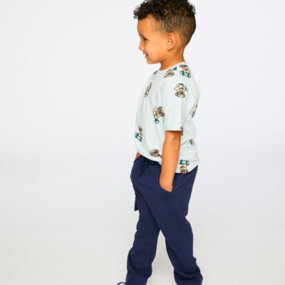 The organic cotton jersey t-shirt in blue with pug print is a playful basic for boys who love adventure. This short-sleeve tee showcases a fun pugs-on-skates allover print that bring movement and style to the look. Crafted in soft organic cotton jersey with a hint of stretch, it ensures breathability and all-day comfort.