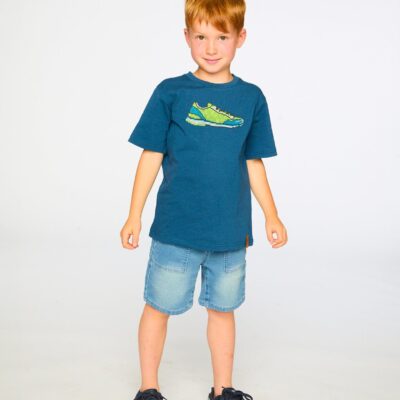 This organic cotton jersey t-shirt in dark blue is playful and bold. The front of this short-sleeve tee shows a cool pixel sneaker shoe graphic print. Crafted in soft organic cotton with a touch of stretch, it’s perfect for fun days of play while staying comfy and cool.