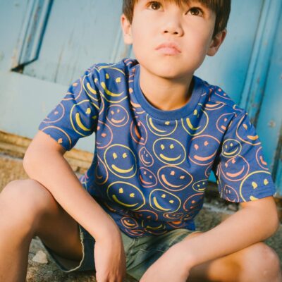 The organic cotton jersey t-shirt in blue with printed smileys is both playful and stylish for boys. This short-sleeve tee features an allover print of cool smiley faces scattered across a blue background, giving it a trendy happy vibe. Made from a soft blend of cotton, polyester, and elastane, it combines comfort, stretch, and durability…