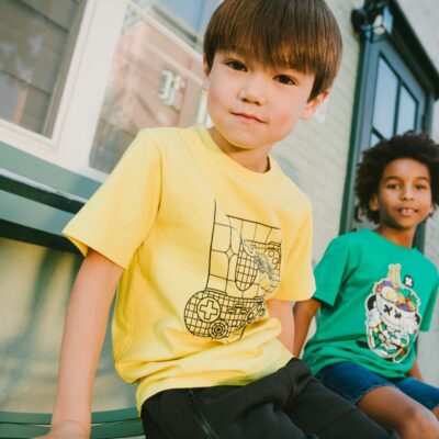 The organic cotton jersey t-shirt with gamer print yellow is a cool and playful piece for boys. This short-sleeve tee showcases a black line graphic of video game controllers across the chest, giving it a trendy gamer-inspired vibe. Made from soft organic cotton with a hint of elastane, it ensures breathable comfort and flexibility for…