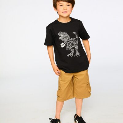 The organic cotton jersey t-shirt with dino print black is a cool and playful piece for boys. This short-sleeve tee showcases a white line graphic of an epic dinosaur with a labyrinth across the chest, giving it a trendy adventure-inspired vibe. Made from soft organic cotton with a hint of elastane, it ensures breathable comfort…